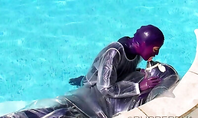 闪亮的橡胶礼服荡妇帕斯卡湿透在尿吮吸阴茎